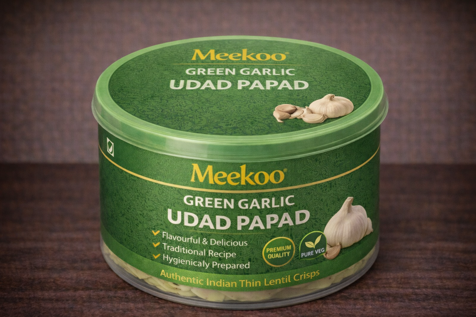 Meekoo Green Garlic Udad Papad, combines premium-quality udad dal with freshly sourced green garlic, offering both health benefits and delectable flavor. The papads are crafted using age-old recipes and carefully balanced spices to ensure every piece is light, flavorful, and free from artificial additives.